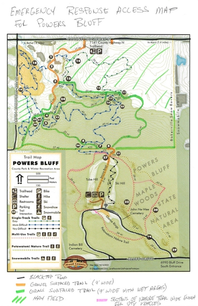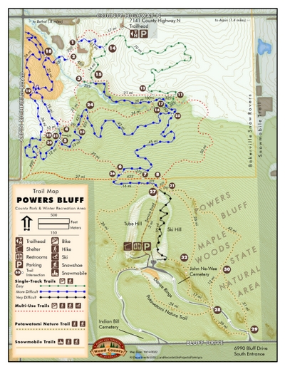 Powers Bluff is a worn down peak of an ancient mountain range which once covered northern Wisconsin. It is comprised almost entirely of solid quartzite, and the highest point of elevation in Wood County. 70 acres of the park is a designated State Natural Area that features a 1.5 mile nature trail. The south 80 acres of the park is listed on the National Register of Historic places as a Native American Cultural Sensitivity Area with preserved Native American dance rings, and burial grounds. In 2012, Wood County acquired 223 acres north of the snow tubing/down hill skiing location. This area will be developed in the future for recreational activities.